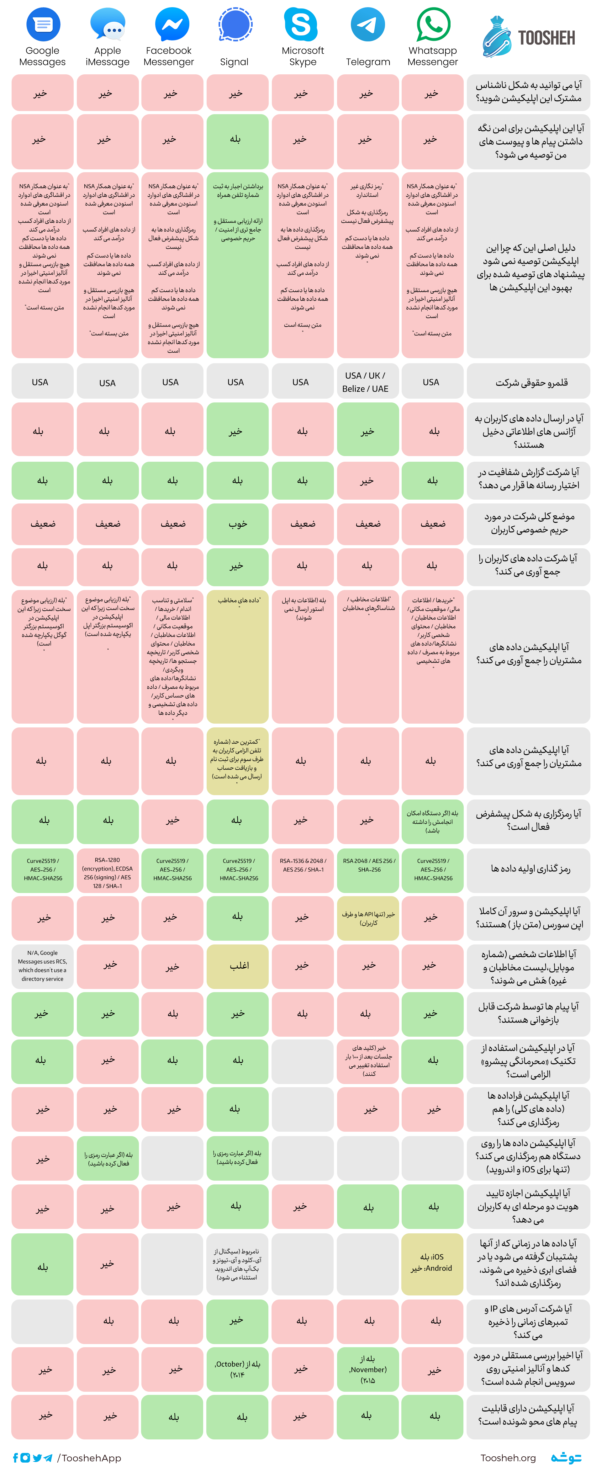وب سایت securemessagingapps.com میزان امنیت پیام رسان ها و توجه آنها به حریم خصوصی کاربران را مورد بررسی قرار داده که خلاصه آن در این جدول توسط تیم توشه ترجمه و گردآوری شده است.
